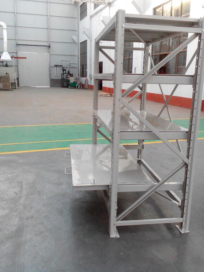 模具貨架,也叫抽屜式貨架:主要用于存放各種模具等物品,因單個模具的重量較重,存儲起來不是很方便,抽屜式模具架即配有抽屜,又配有天車葫蘆,可以根據(jù)模具的特性來設計的貨架存儲。根據(jù)層載能力要求分為輕型模具貨架和模具貨架。整體采用拼裝結構,運輸方便,組裝簡單、快捷。配有安全保護裝置。